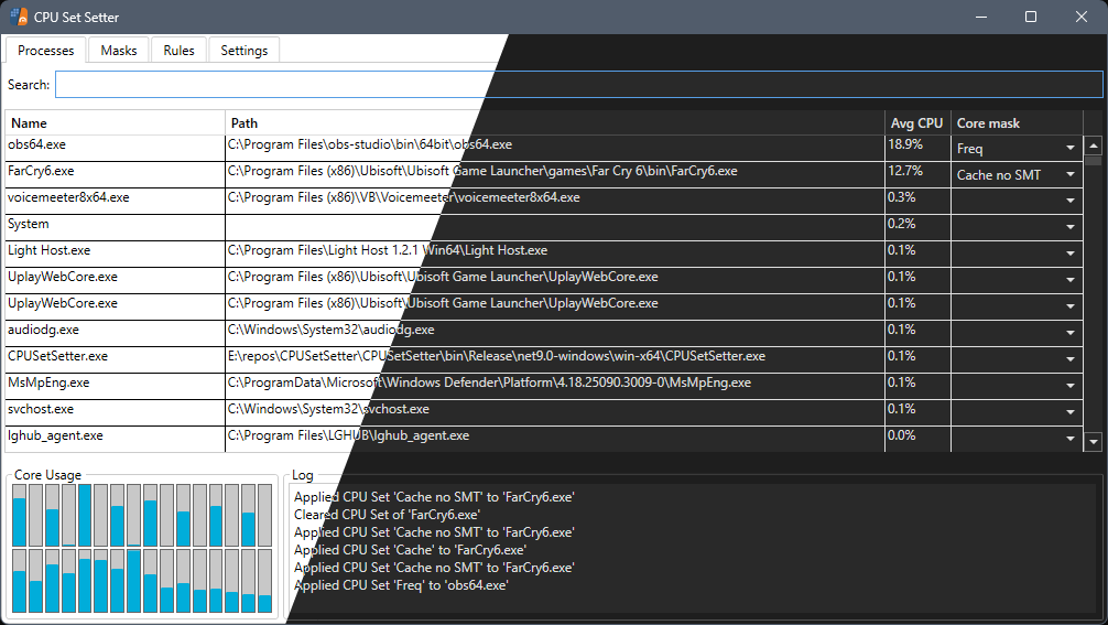 2、CPUSetSetter:手动指定运行游戏用的 CPU 核。该项目是专为 Windows 11 设计的性能优化工具,利用 CPU Sets 技术,让用户可以自由控制游戏和应用程序运行时使用的 CPU 核,全程无需重启程序。