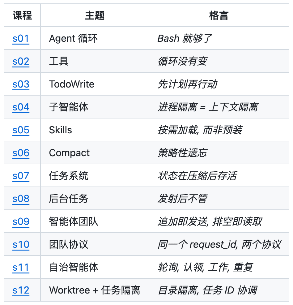 32、learn-claude-code:从零开始动手实现 AI Agent。该项目是讲解如何从零构建类似 Claude Code 的 AI Agent 工具,共计 12 节课,每节课都有一个可运行的 Python 文件。内容从最基础的 Agent 循环,逐步叠加工具调用、任务规划、子智能体、上下文压缩、多智能体协作和自主执行等功能,最终构建出一个完整的 AI Agent 系统。来自 @喜BFoCE 的分享