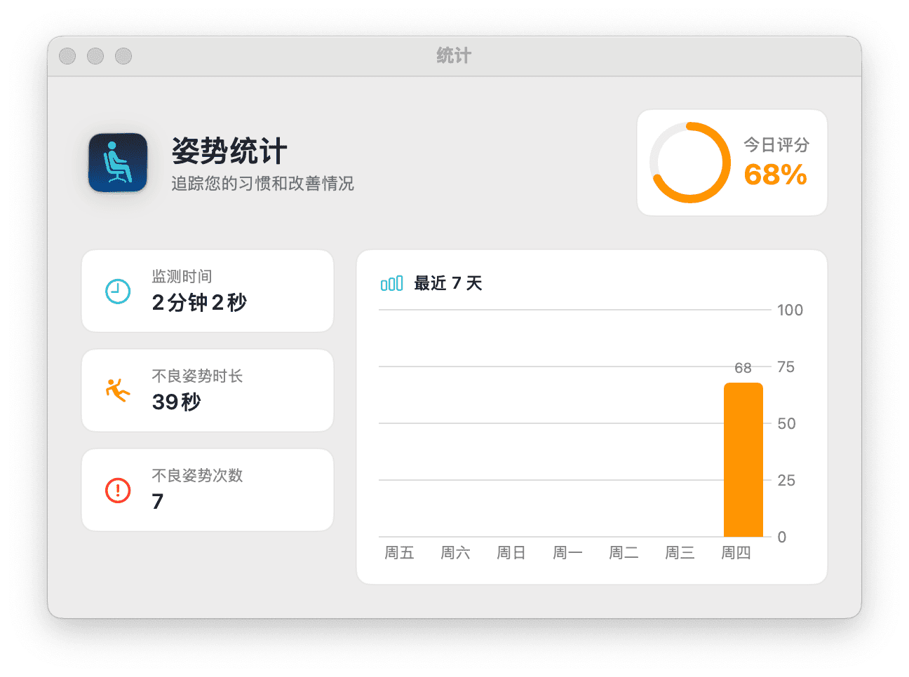 30、dorso:矫正坐姿的 macOS 应用。这是一款用 Swift 开发的 macOS 坐姿监测应用,可通过摄像头或 AirPods 实时检测坐姿。当发现用户驼背或前倾时,应用会逐渐模糊屏幕,从而提醒用户及时纠正坐姿。
